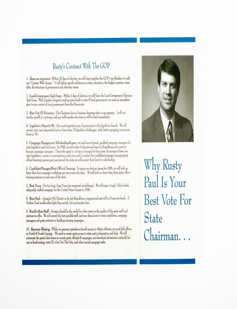convention, and then the state convention.” (Reflections on Georgia Politics Oral History Collection, ROGP 121 Rusty Paul) Paul’s commitment to running for the office of Chairman was in part what got him elected. His distance from perceived problems in the state party, his experience managing political campaigns, and his political plan for the party made him an appealing choice. His campaign literature focused on making a positive impact on Georgia politics. Paul capitalized on recent Republican successes and pitched “Rusty’s Contract With the GOP,” a la Newt Gingrich’s 1994 Contract With America, in his campaign literature.